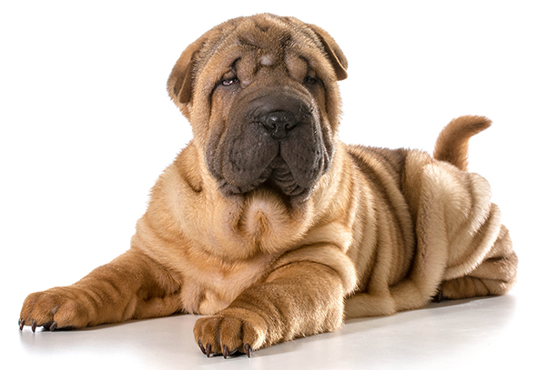 Shar Peis are an ancient breed originating in China, bred as guard dogs and hunting dogs, and are known to be highly intelligent, devoted and independent. They are thought to be a relative of the Chow Chow, as they are both strongly protective and suspicious of strangers, and share the familiar blue-black tongue. Their famed wrinkled-looking skin is similar to that of the French Bulldog, Pug or Dogue de Bordeaux, and their loyal and sometimes fierce persona is like many of the other traditional guarding and sporting dog breeds.